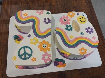 Your choice of cake size, flavors and color palette. We all all the rainbows, smiling flowers, peace, love and FUN. *Shown is a two number cake to feed 40 people, priced at $115