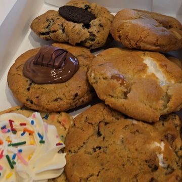 Six of our oversized decadent stuffed cookies! (the stuffed triple chocolate chip filled with a s’more, the funfetti filled with a cheesecake filling, the kitchen sink filled with a s’more, the Oreo filled with cheesecake, the white chocolate macadamia nut filled with caramel cheesecake, and the Nutella)