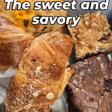 The sweet and savory box comes with a freshly baked focaccia bread, two almond croissants (or regular) and four sweet bars, ( brownies, crumble bars or seasonal)