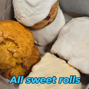 The all the sweet rolls box comes with three blueberry biscuits with glaze three sweet potato biscuits with honey and two jumbo size cinnamon rolls, one with sweet icing and one with cream cheese frosting